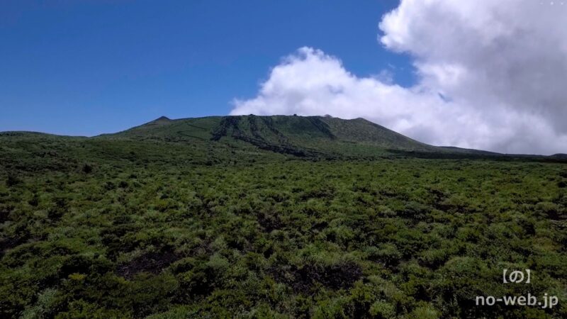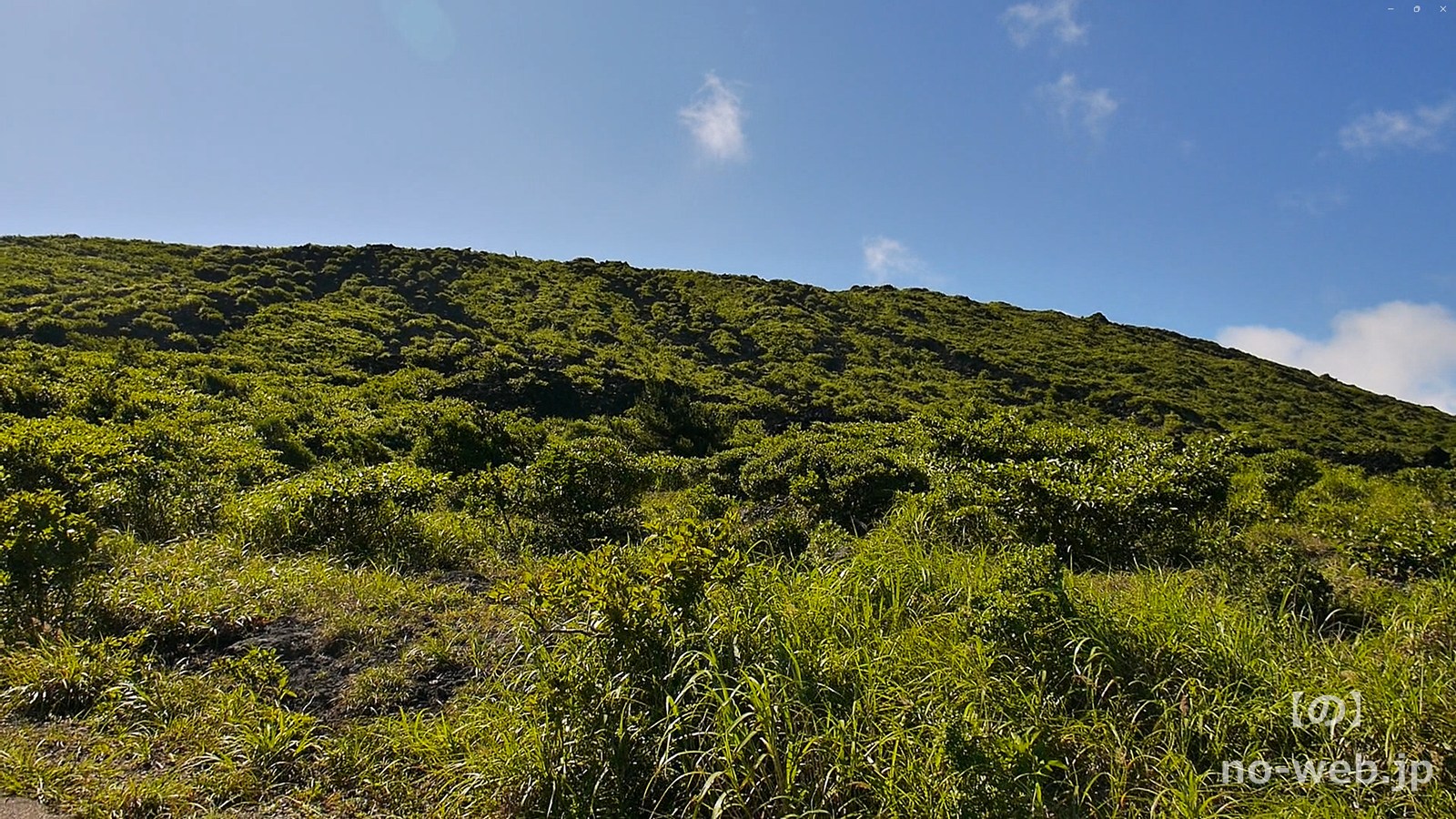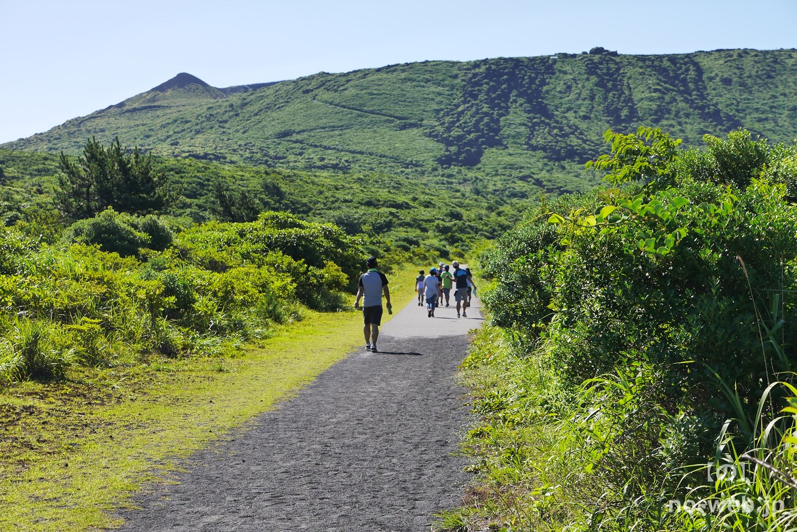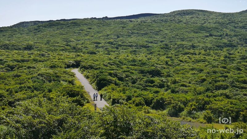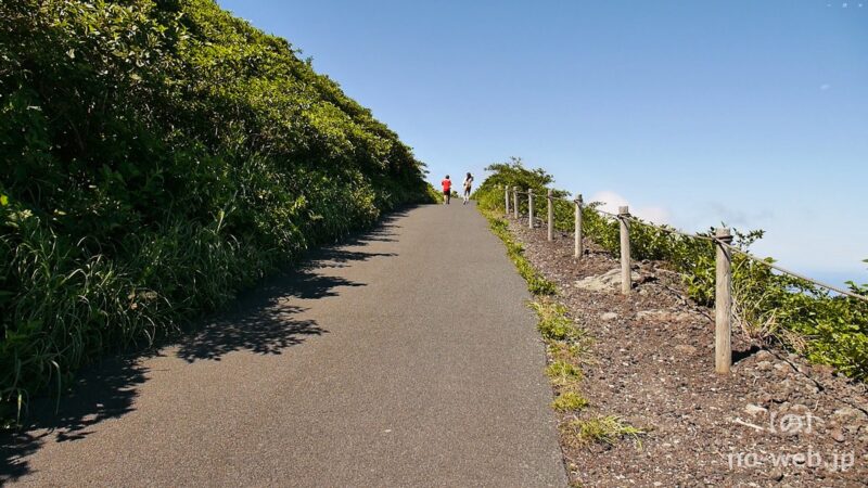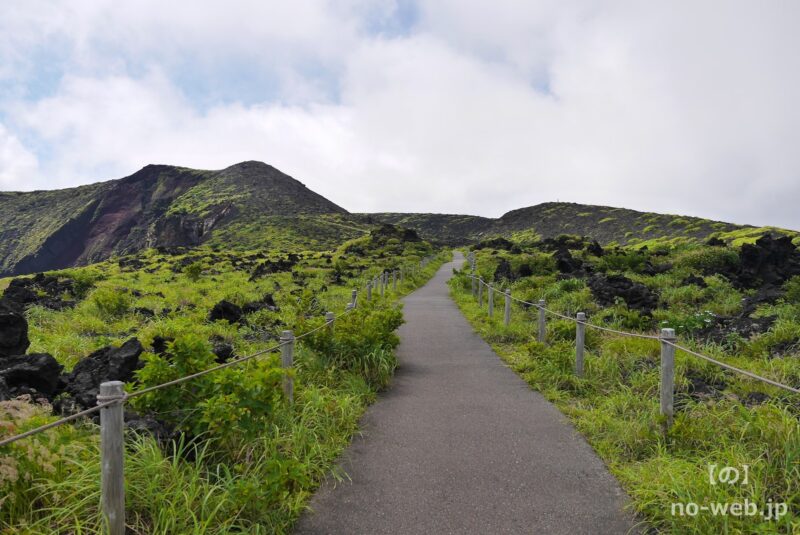溶岩と背の低い植物が広がるカルデラ床の中を貫く舗装路が山頂遊歩道です。