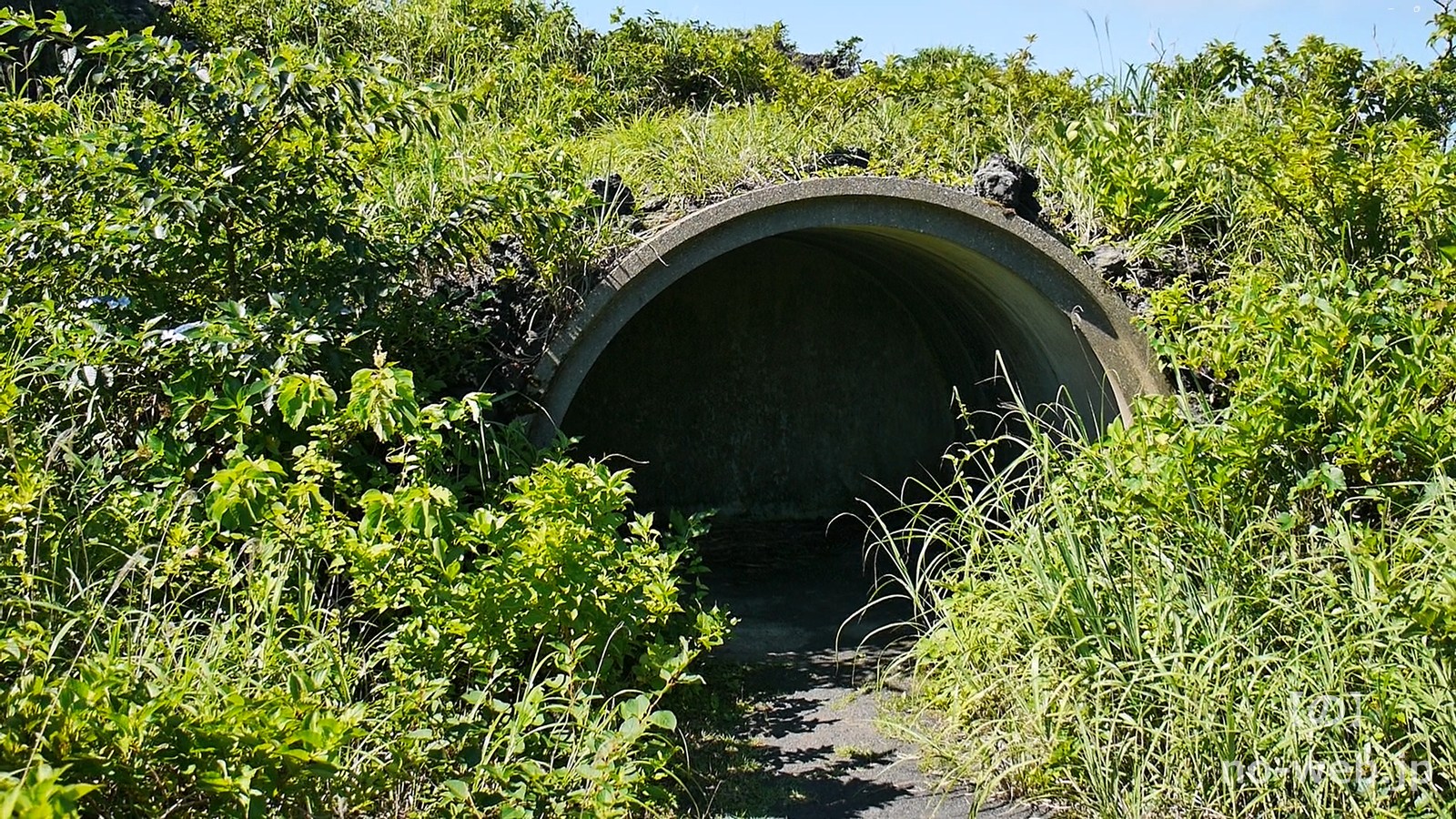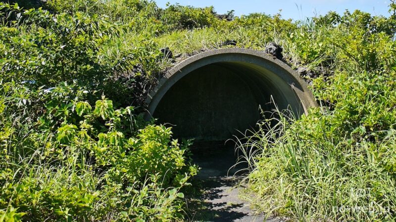 大規模噴火の際に逃げ込んでも助かるのか不安なくらい小さくて薄い土管の切れ端のような構造です。