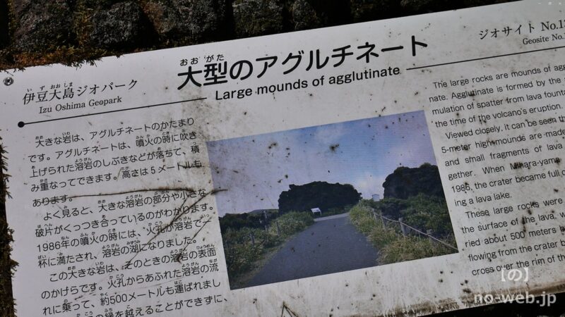 案内板にはアグルチネートと記されています。1986年噴火の際に飛び散ったマグマの飛沫が集まり固まってこの形に至ったとのことです。