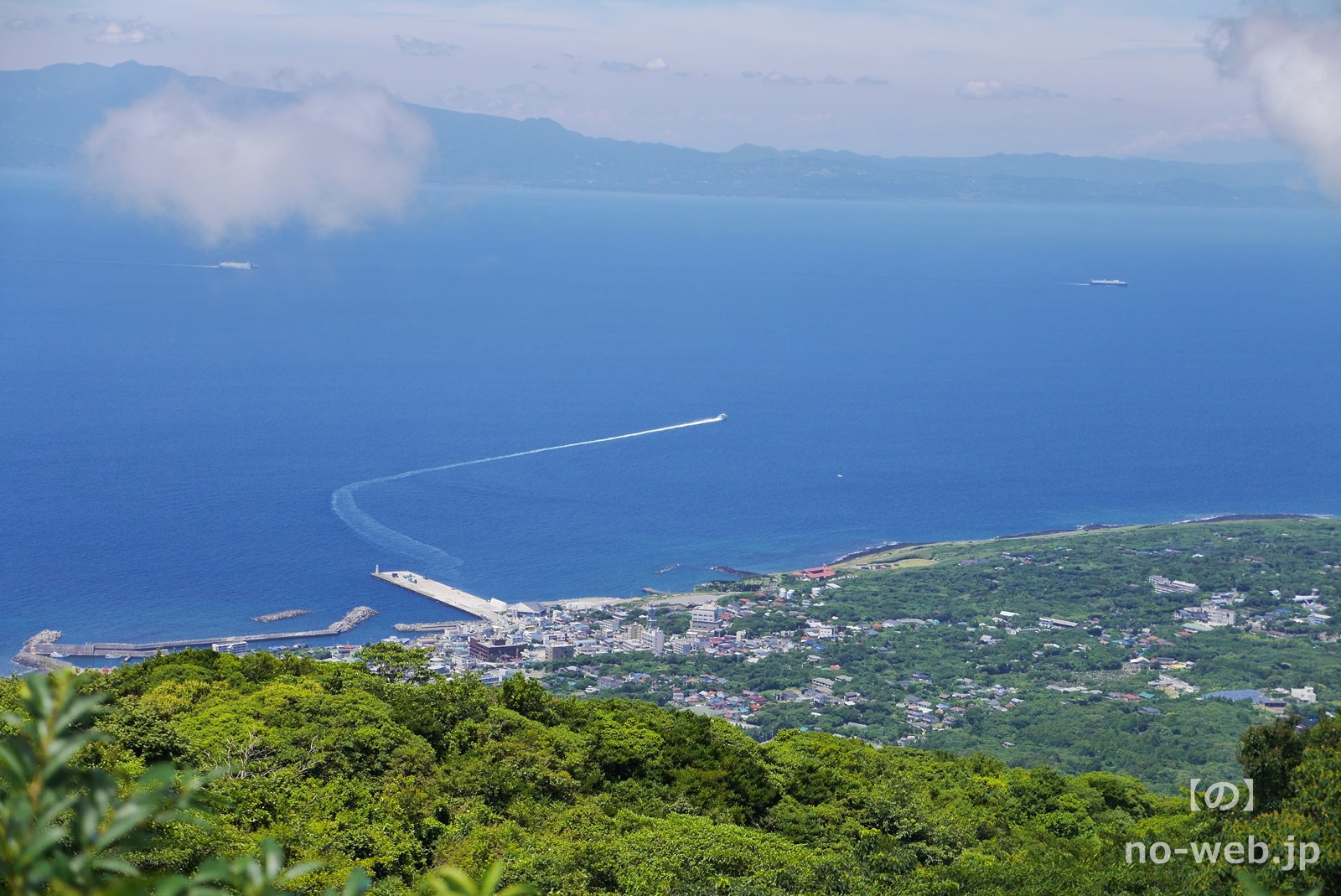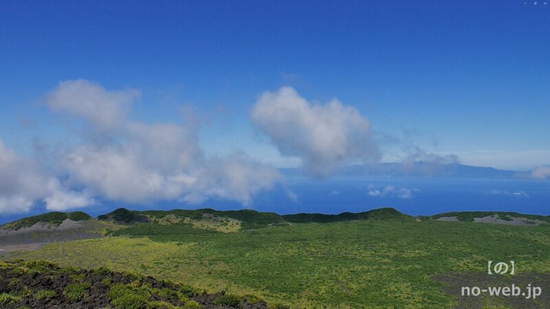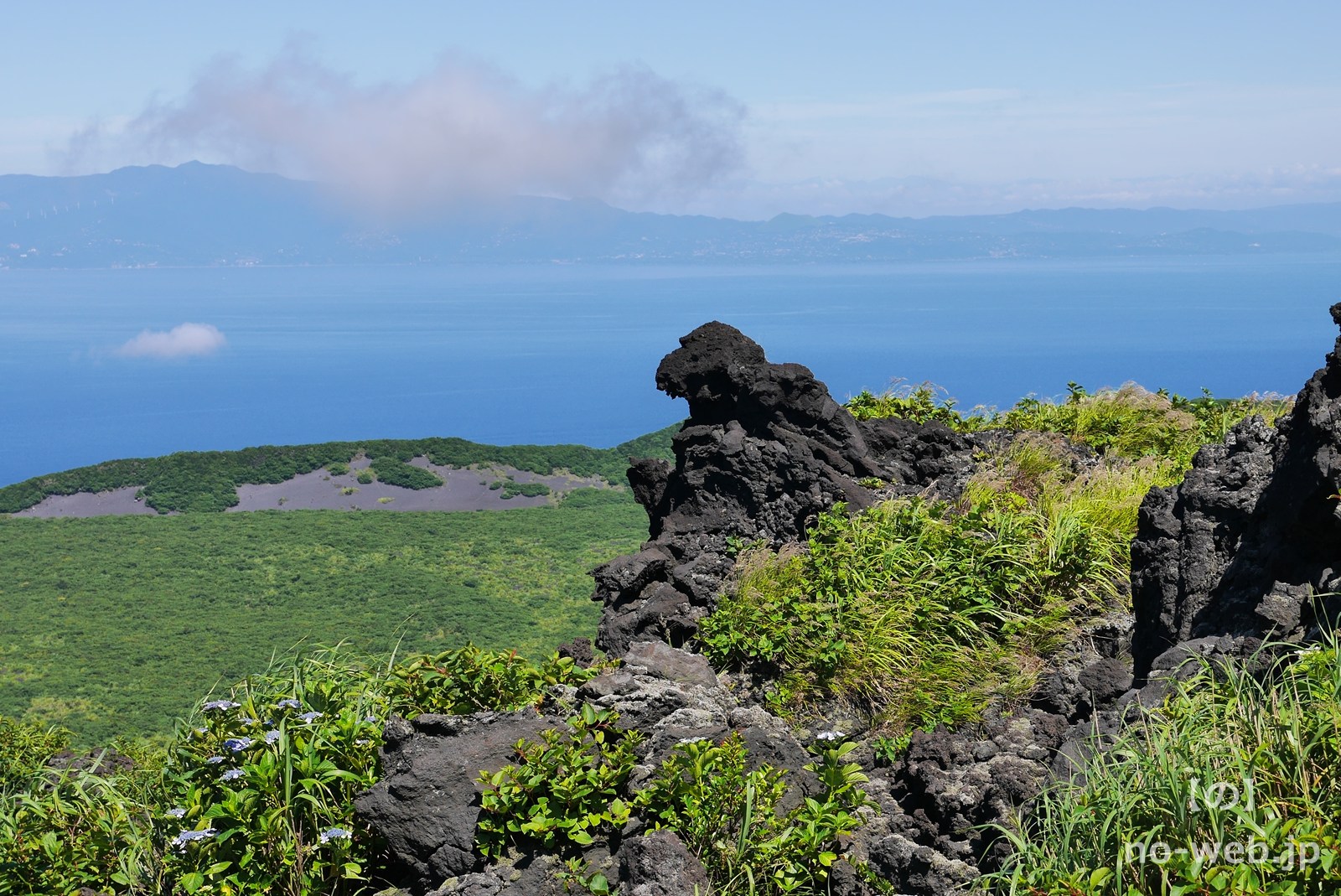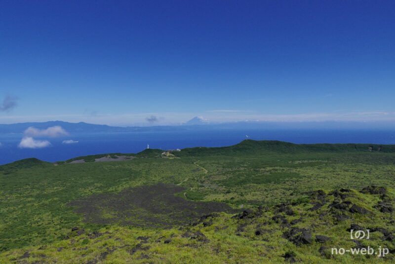 さっきまで歩いてきた山頂遊歩道のほぼ全部が視界に入り、溶岩と植物のコントラスト、碧い海の先には富士山や伊豆半島がうっすらと存在しています。