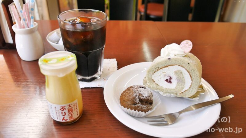 カフェで大島桜ロール・大島牛乳ぷりん・シュークリーム・アイスコーヒーを注文。