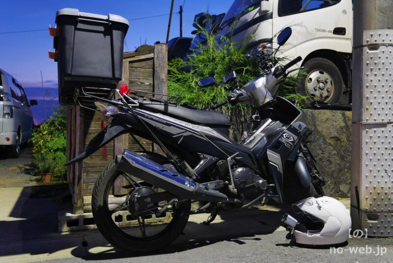 バイクを邪魔にならない場所まで押し歩きしてから荷物を固定します。